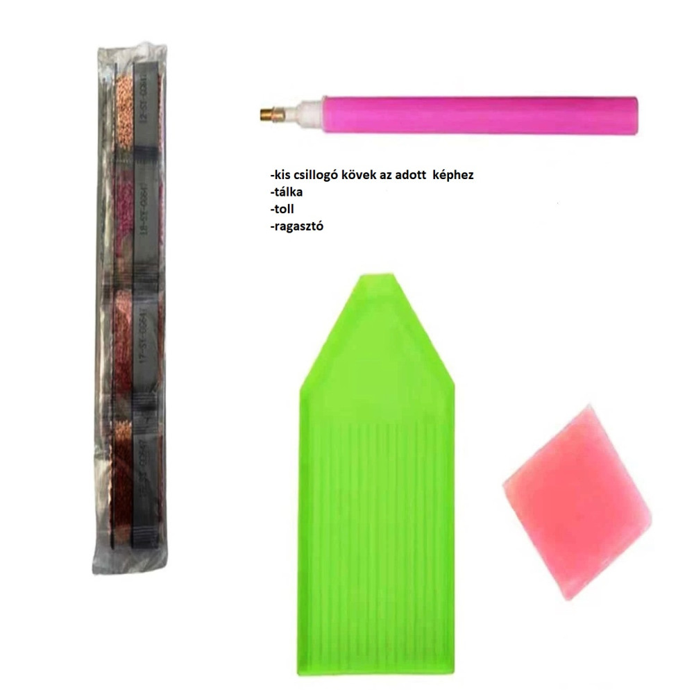 Ez a szett tartalmazza a 50x65cm vászon méretű képet (a kirakható kép kisebb a vászonnál kb 8-10cm-el) továbbá a hozzá tartozó kis "gyémánt" kövecskéket,egy tálkát,egy tollat és ragasztót.