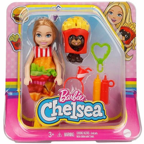 Chelsea öltöztetős baba egy hamburgerjelmezben pompázik, amely megnyerő dizájnt és fodros "saláta" feltétet tartalmaz. Imádnivaló felépítését egy üdítőspohárból és sárga cipőből készült fejfedő fejezi be; még egy kutyás társa is van, aki a sajátjához illő jelmezbe van öltözve. A gyerekek bárhová magukkal vihetik öltözködési mulatságukat, ha a Chelsea babát egy hátizsákhoz vagy ruhadarabhoz rögzítik egy kulcstartó-bűvös kiegészítő segítségével.