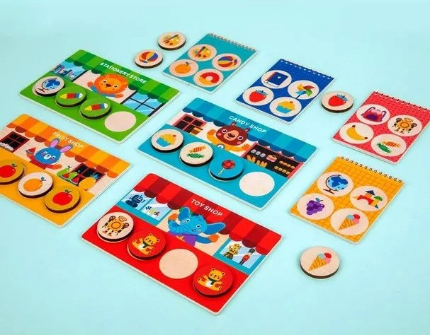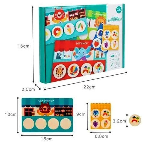 Ismerkedjen meg ezzel a különleges Fa állatos szupermarket játékkal, amely a vizuális memória fejlesztését célozza meg játékos és interaktív módon. A szett tartalmaz négy fa szupermarket kártyát, négy bevásárlólistát, valamint 16 tokenből álló termékkészletet, amelyek különböző boltok termékeit képviselik: gyümölcsöket az Aprozárnál, játékokat a Játékboltban és így tovább.