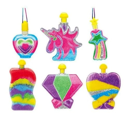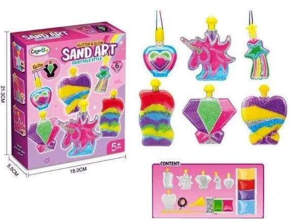 - Tartalom: 6 műanyag palack saját kupakkal, tölcsér, pálcika, színes szemcsés zacskók, világító homok