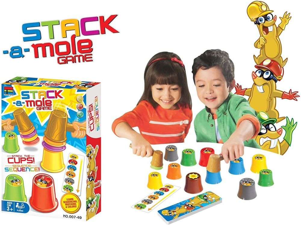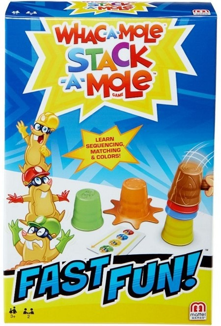 • A gyerekek kedvenc Whac-A-Mole játéka által ihletett Stack-A-Mole szórakoztató módja annak, hogy a kicsiket megtanítsuk a színekre, a párosításra és a sorrendiségre. Az Ön feladata, hogy a kalapács segítségével egy bizonyos sorrendben egymásra rakja a vakondcsészéket. De siess – az ellenfeled először próbálja összerakni őket. Legyen Ön az első, aki a megfelelő sorrendben rakja egymásra az összes poharat, és nyer! Kalapácsütés, vakondrakás és tanulási móka! 2 játékosnak. 3 éves és idősebb.