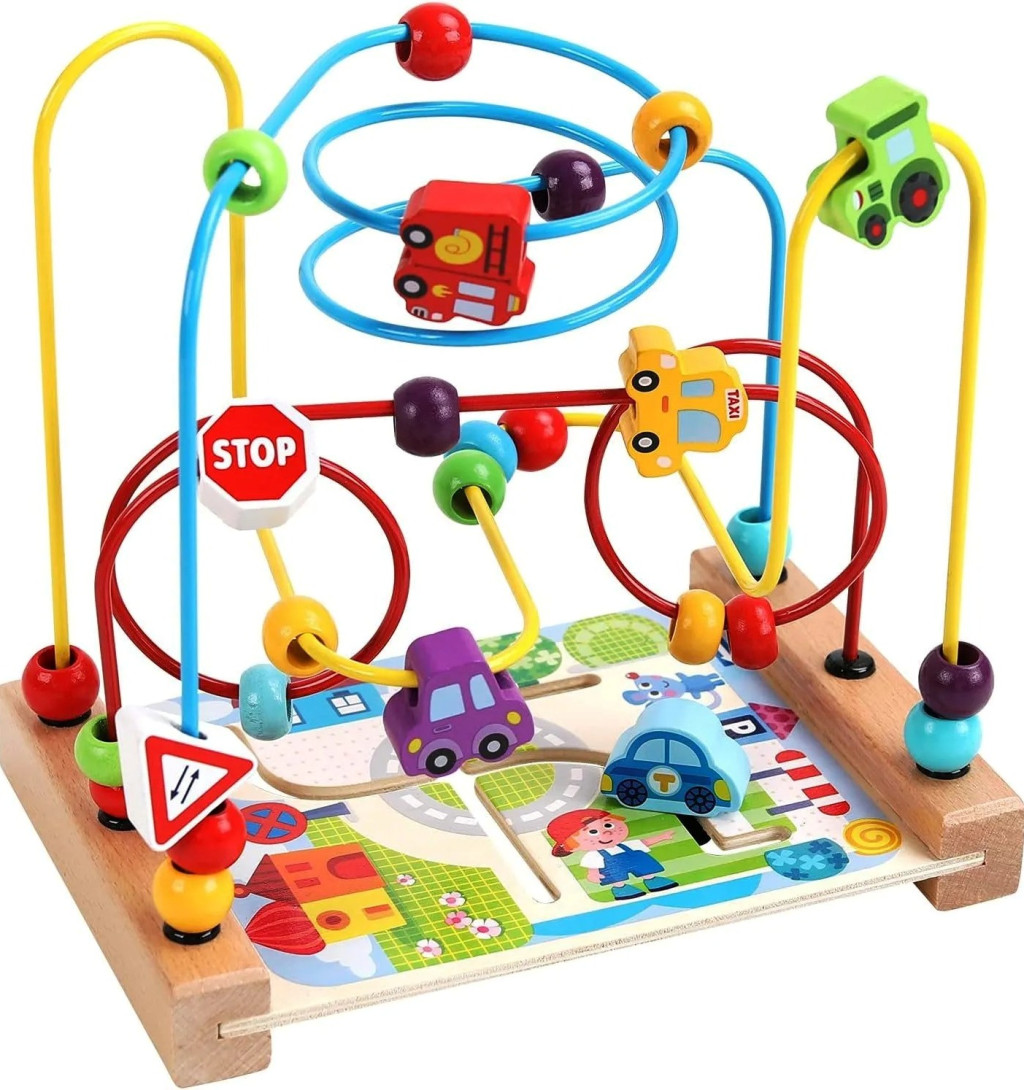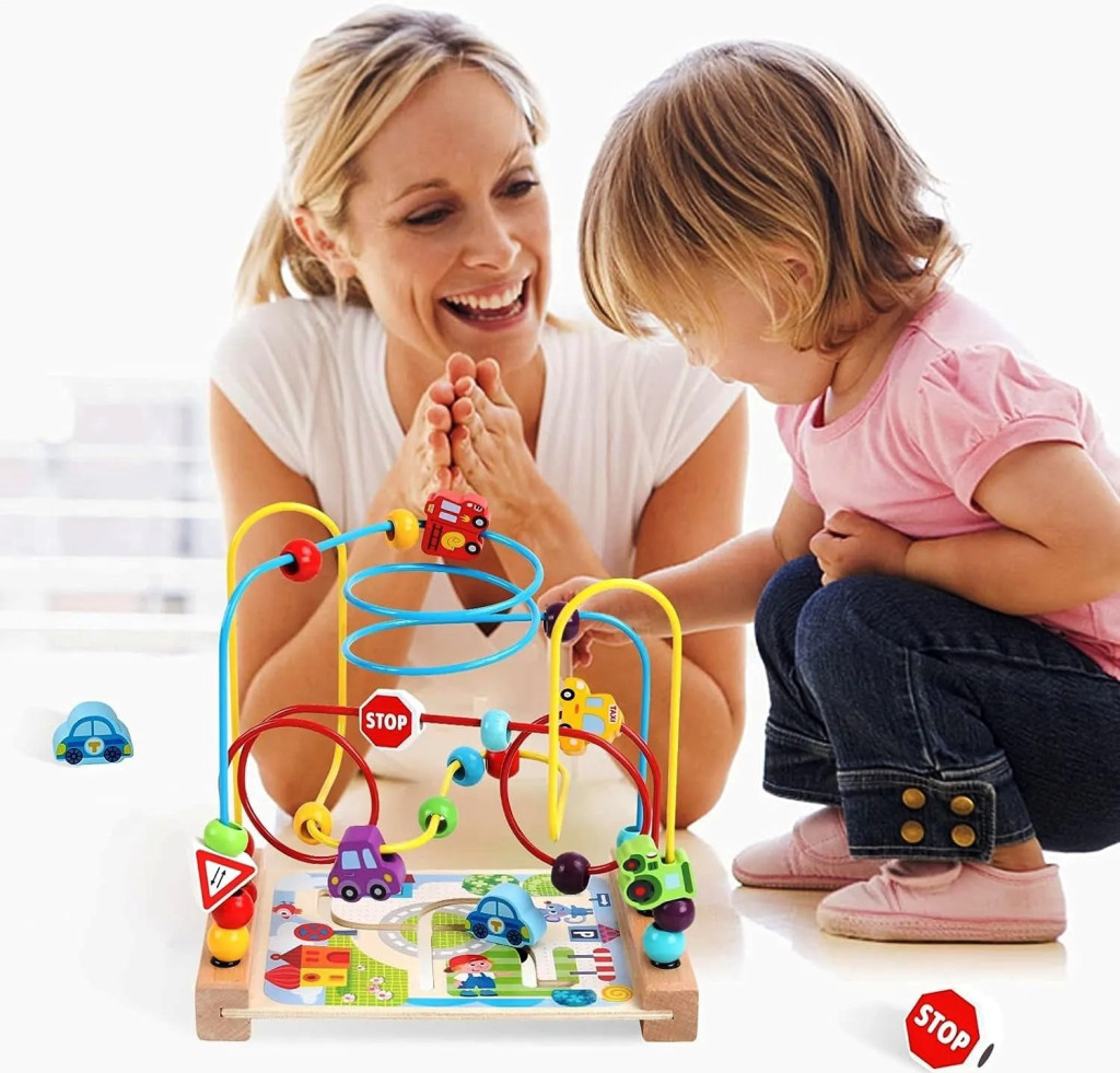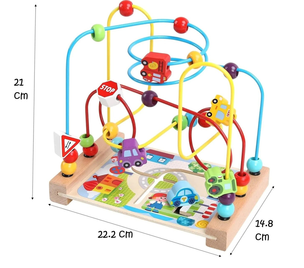 Színes és szórakoztató – A játék színes fagolyói és fa autói lekötik a gyerekek figyelmét, miközben azokat irányítják a pályán.