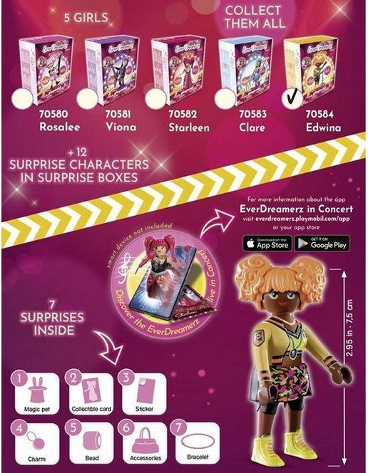 Az EverDreamerz izgalmas álomutazás folytatódik. Ezúttal a mágikus amulett elhozza az öt barátot az elbűvölő zenevilágba. Az énekes tehetség, Starleen izgatott, hogy végre megélheti álmát, egy nagyszerű popkarrierről. Ám a lányok hamarosan rájönnek, hogy egy időhurok csapdájába estek, amelyben minden nap mint nap megismétlődik. Úgy tűnik, hogy Lady Nightmarre aljas terve, hogy a barátait örökre a Music Worldben tartsa, bevált. Edwina sportász mindig nyitott az újdonságokra, és rövid idő után már a dobokon is megmutatja tehetségét. Vajon sikerül-e Edwinának és az EverDreamerznek szenvedéllyel és ritmusérzékkel megszabadulnia ennek a zenei rémálomnak a végtelen ütemétől? A játékkészlet sokoldalú EverDreamerz sportász Edwinát dobbal és macskával, szilikon karkötőt, dekoratív gyöngyöket, matricákat, kereskedési kártyát és egyéb fantasztikus kiegészítőket tartalmaz. Az integrált AR funkcióval még közelebb kerülhet az EverDreamerz zenei világhoz. Egyszerűen olvassa be a kereskedési kártyát okostelefonjával, és élvezze az EverDreamerz élő élményt! 5 éves kortól ajánlott.