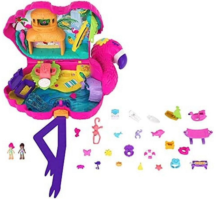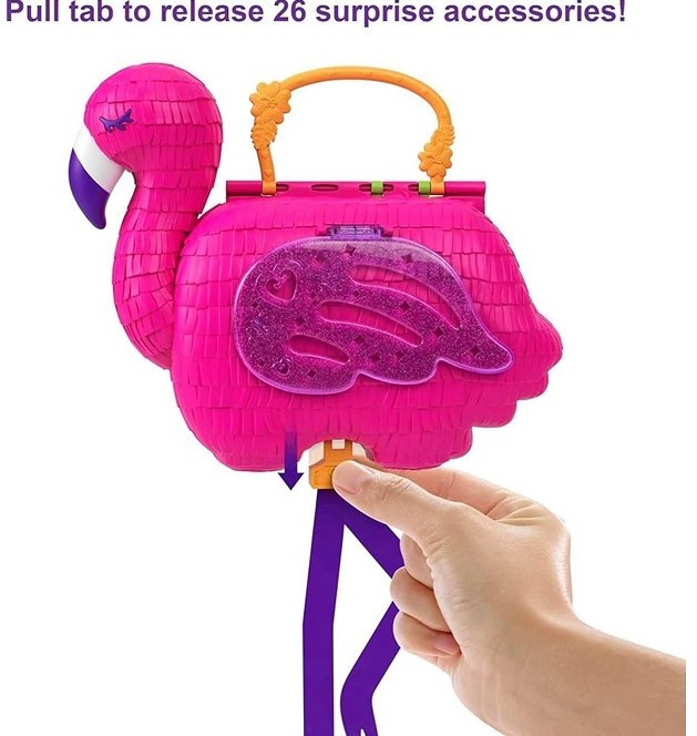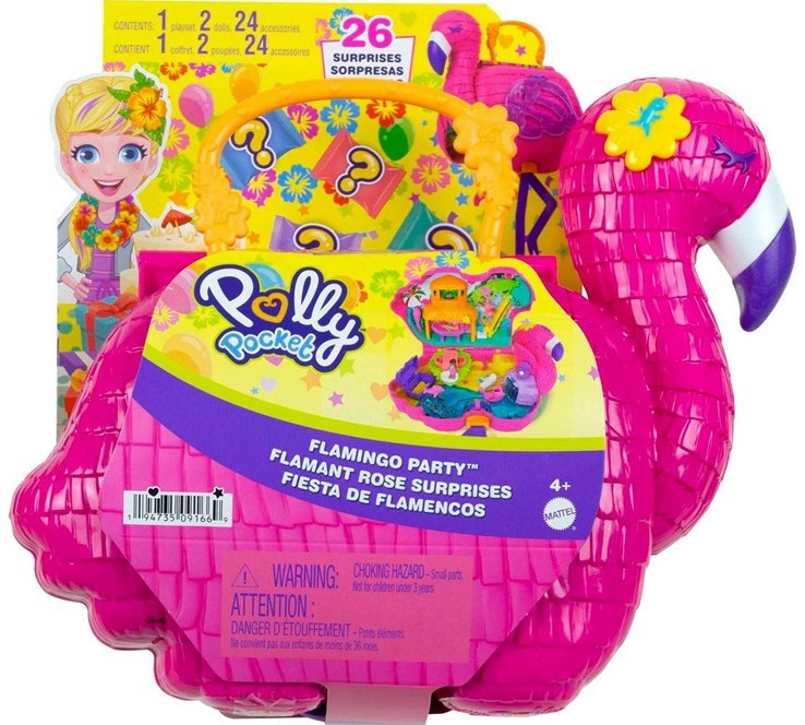 • Ez egy trópusi buli a Polly Pocket Flamingo Party játékkészlettel! Indítsa el a bulizást a flamingó láb füleinek meghúzásával, majd nézze meg a konfetti színes folyamát és a 26 meglepetést a játékkészletből!